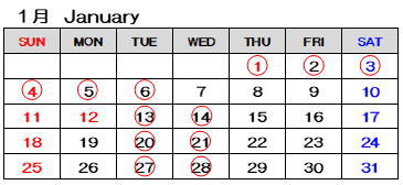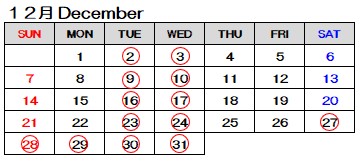2025年12月1日(月)~12月26日(金) 平日 12:00 ~ 18:00 土日祝 10:00 ~ 18:00 (○印は定休日:火曜日・水曜日)